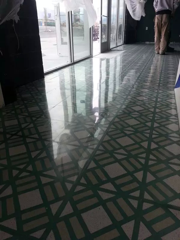 Concrete Polishing Systems公司的員工從來沒有見過這種地磚,看起來像是預(yù)制混凝土和一種骨料的結(jié)合。最大的挑戰(zhàn)是這種地磚的復(fù)雜圖案,任何研磨都會把表面的圖案磨掉露出下面的素混凝土。在地磚上做了一些樣板試驗后,承包方?jīng)Q定接受這個挑戰(zhàn)。